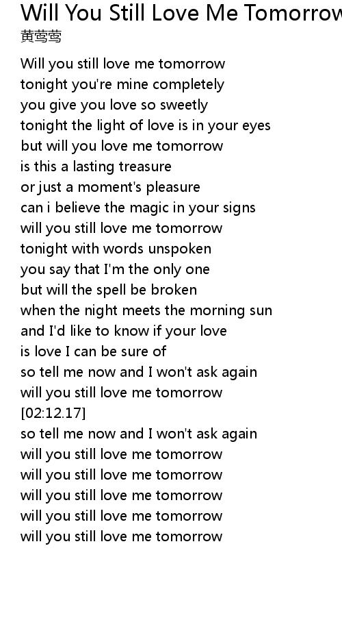 Will You Still Love Me Tomorow The Shirelles Lyrics Subtitulada Español Help us caption & translate this video!. Will You Still Love Me Tomorrow Lyrics are a subject that is being searched for and favored by netizens nowadays. You can Download the Will You Still Love Me Tomorrow Lyrics here. Save all royalty-free pics. WILL U STILL LOVE ME TOMORROW -THE SHIRELLES (LYRICS), Hear this my ♥ Will my heart be broken when the night meets the morning sun? I'd like to know that your love is the love I can be .